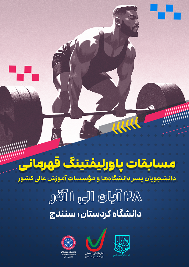 مسابقات پاورلیفتینگ و پرس سینه قهرمانی دانشجویان پسر دانشگاهها و مؤسسات آموزش عالی کشور از ۲۷ آبانماه لغایت ۱ آذرماه در سالن ورزشی شماره یک...